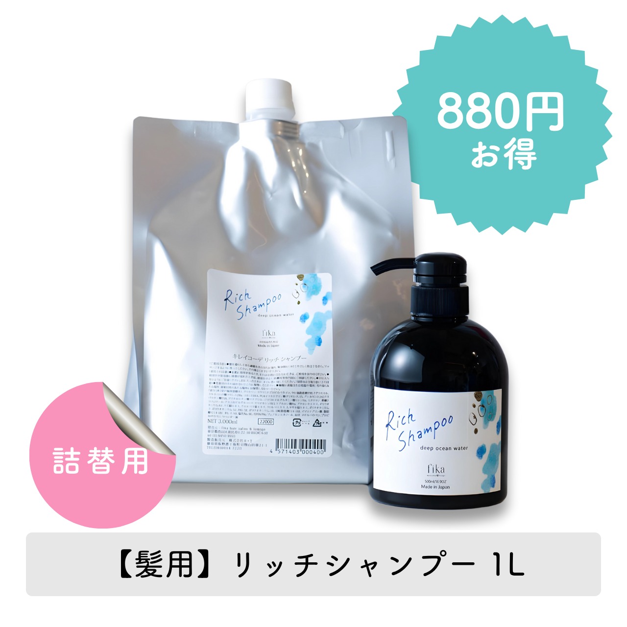 海洋深層水リッチシャンプーのお得な詰め替えサイズ(1リットル)です。
