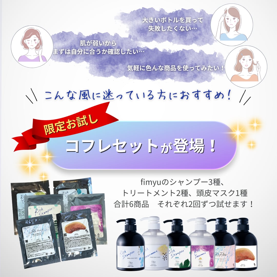 fimyuのシャンプー3種、トリートメント2種、頭皮マスク1種の